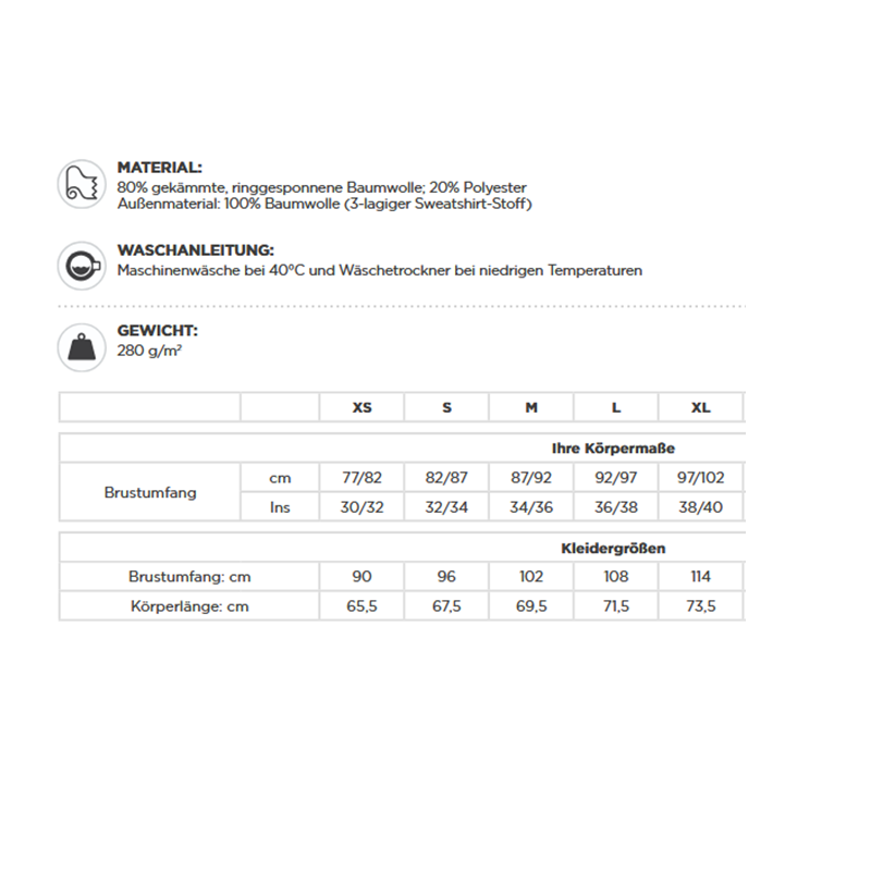Oberstoff (280 g/m²): 80% Baumwolle, ringgesponnen und gekämmt, 20% Polyester (3-lagiger Stoff)