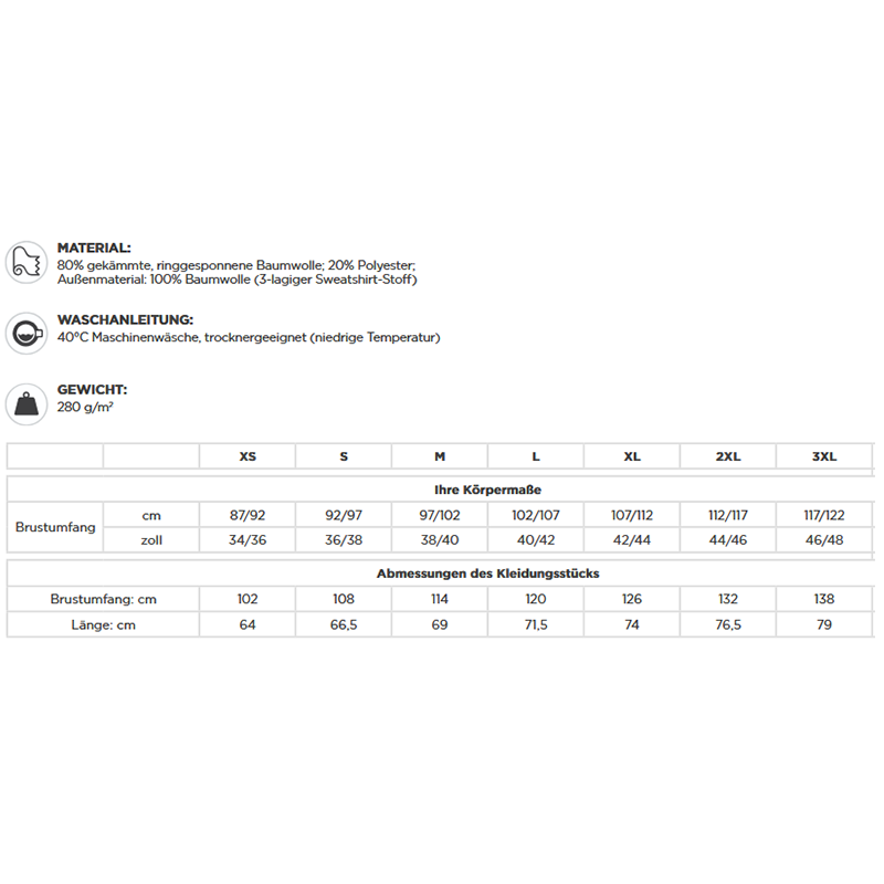 Oberstoff (280 g/m²): 80% Baumwolle, ringgesponnen und gekämmt, 20% Polyester